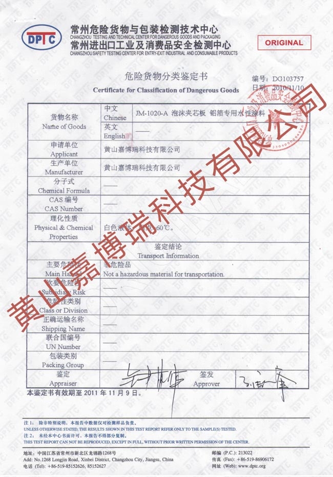 危險貨物分類鑒定書_JM-1020-A
